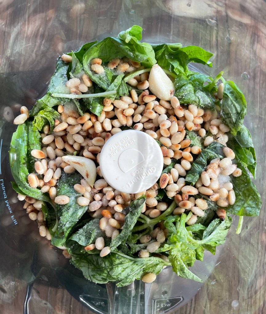 - Add basil, pine nuts, garlic, olive oil, lemon juice, and salt to a food processer (or blender!) and blend until a creamy consistency forms.